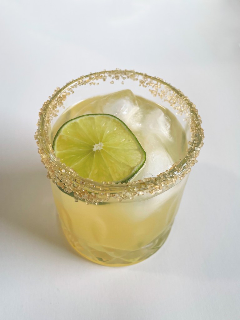 Now, my particular style of at home bartender is to disregard any rules (probably more for lack of knowing what they are than anything else) and to just throw together things and see if it tastes good. But this one has tequila and triple sec to stick with the basics though, then Simply brand peach juice, Trader Joe’s jalapeño limeade, and some lime slices. Wet the rim of the glass, dip it in a bowl of turbinado sugar, throw in a lot of ice, then get to mixing!