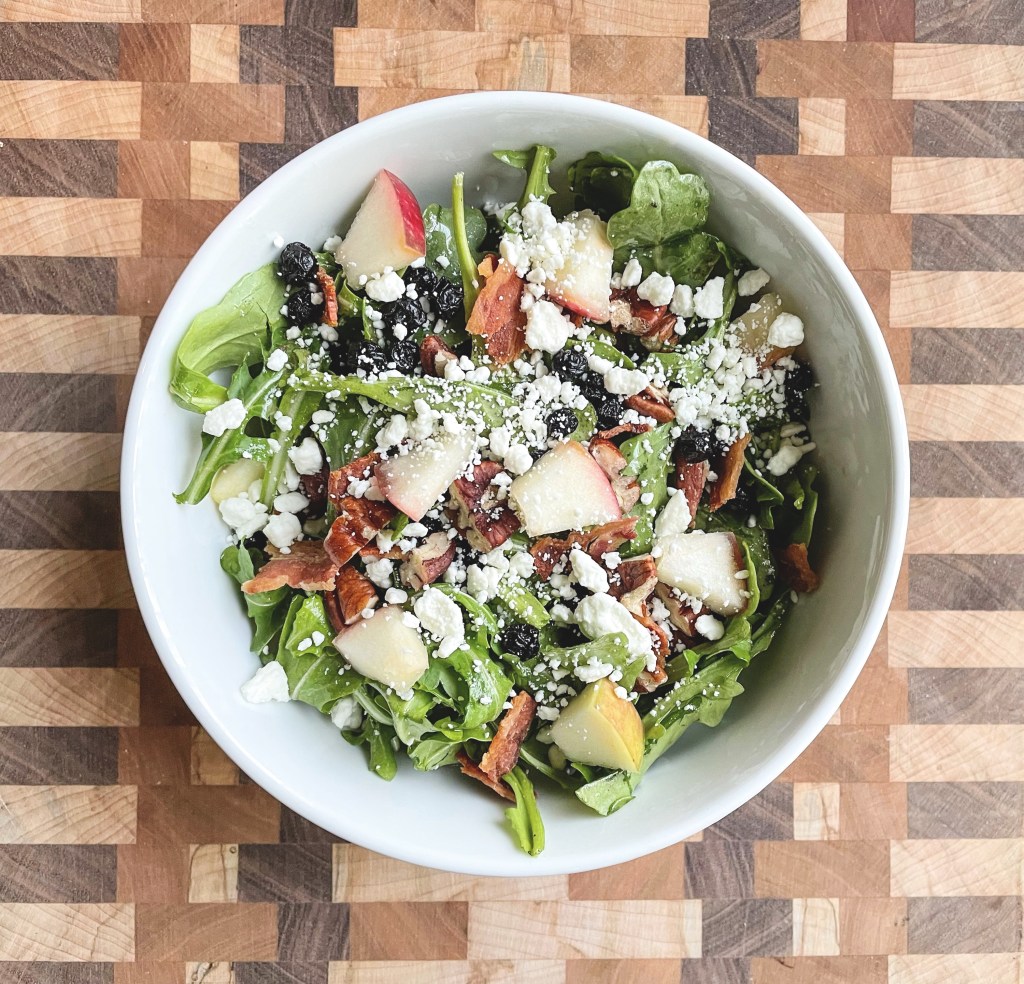 Every once in awhile the craving will hit hard for a salad and of all the cravings, that’s one I feel like I should be quick to jump on, right?! I like my salads on the sweet side and this one definitely fits that bill, but the arugula and the crumbled bacon off set that sweetness. If you’re looking to lower an already pretty short prep time (me, almost always), buy a bag of pre-sliced apples and a package of pre-cooked bacon. Microwaving the bacon for just 30 seconds was enough to crunch it up a bit and make it easy to crumble.
